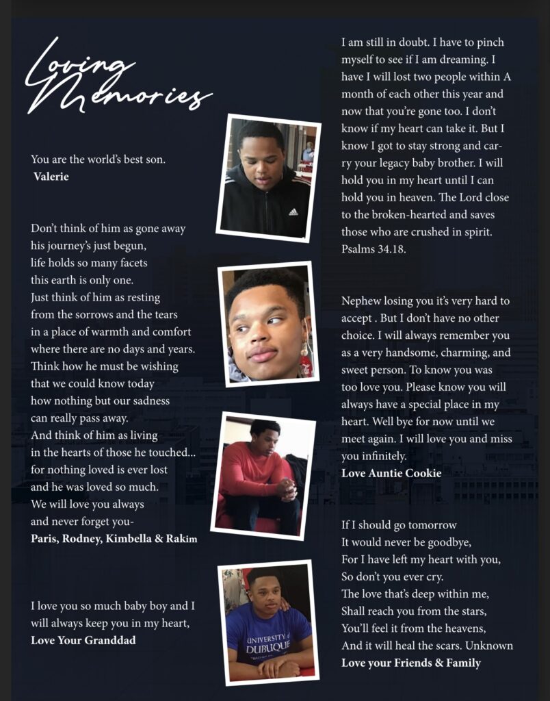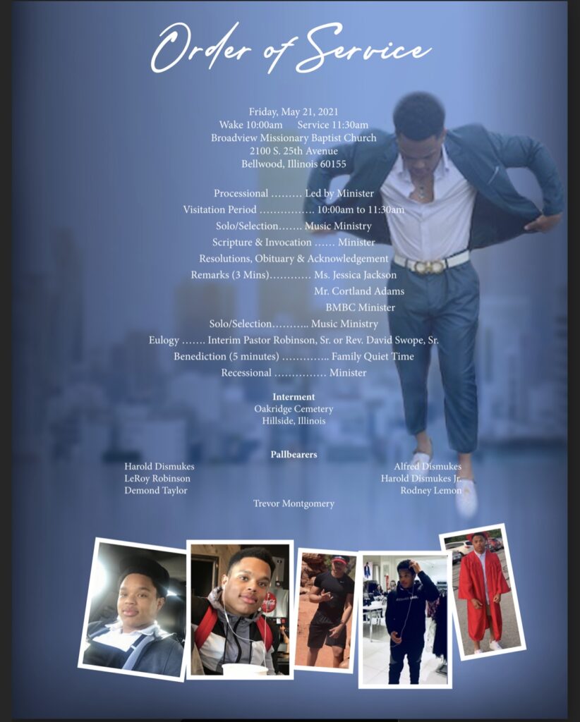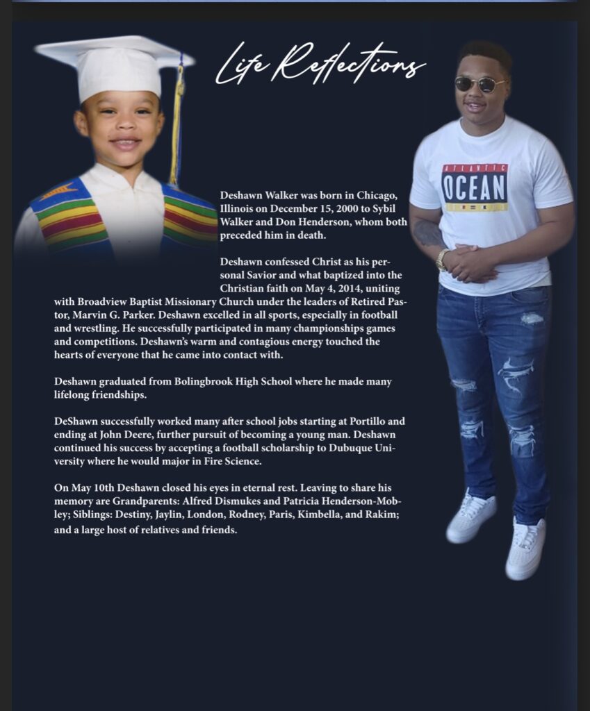 DeShawn successfully worked many after school jobs starting at Portillo and ending at John Deere, further pursuit of becoming an young man. Deshawn continued his success by accepting a football scholarship to Dubuque University where he would major in Fire Science. On May 10th Deshawn closed his eyes in eternal rest. Leaving to share his memory are: Grandparents Alfred Dismukes and Patricia Henderson-Mobley. Siblings: Destiny, Jaylin, London, Rodney, Paris, Kimbella, Rakim. And a large host of relatives and friends.